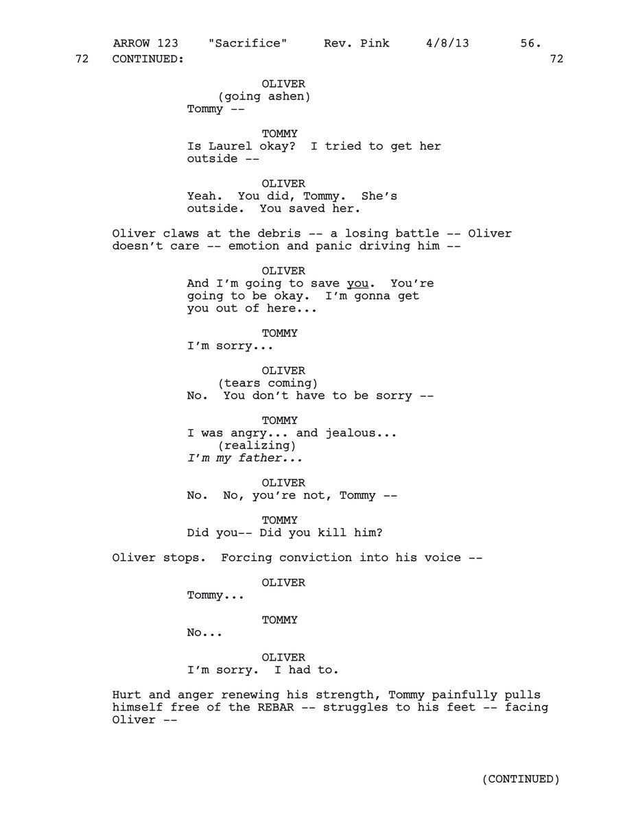 It at least one case, fake script pages were created in case spoilers came out. For example, today Guggenheim shared two alternate script pages for the Arrow Season 1 finale “Sacrifice” in which… Tommy Merlyn did not die. In fact, it sets things up for Tommy to be the Dark Archer rival that a lot of us thought he was going to be when the series began.