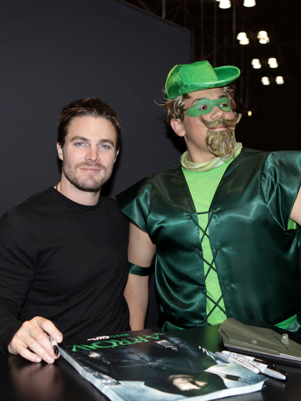Warner Bros. has provided us with some images of Stephen Amell, Katie Cassidy, Willa Holland, and Arrow executive producer Marc Guggenheim at this year’s New York Comic Con. While there they also snapped some pictures with a fan dressed as Green Arrow.