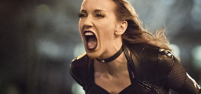Yep, that is indeed Arrow’s Laurel Lance, as played by Katie Cassidy, in the episode. How? It’s her other-dimensional Earth-2 counterpart. There, she’s not the Black Canary; instead, she’s calling herself the Black Siren.