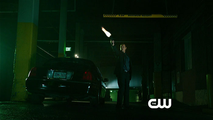 A few days ago, The CW released an Arrow preview clip featuring the Arrow serving his special kind of justice to warn criminal Adam Hunt. Now, thanks to Mr. Video, we have some screen grabs from the scene.