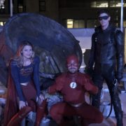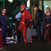 Stephen Amell has shared a photo of himself, Grant Gustin, and Melissa Benoist in front of the Bat-Signal from this year’s DC TV crossover.