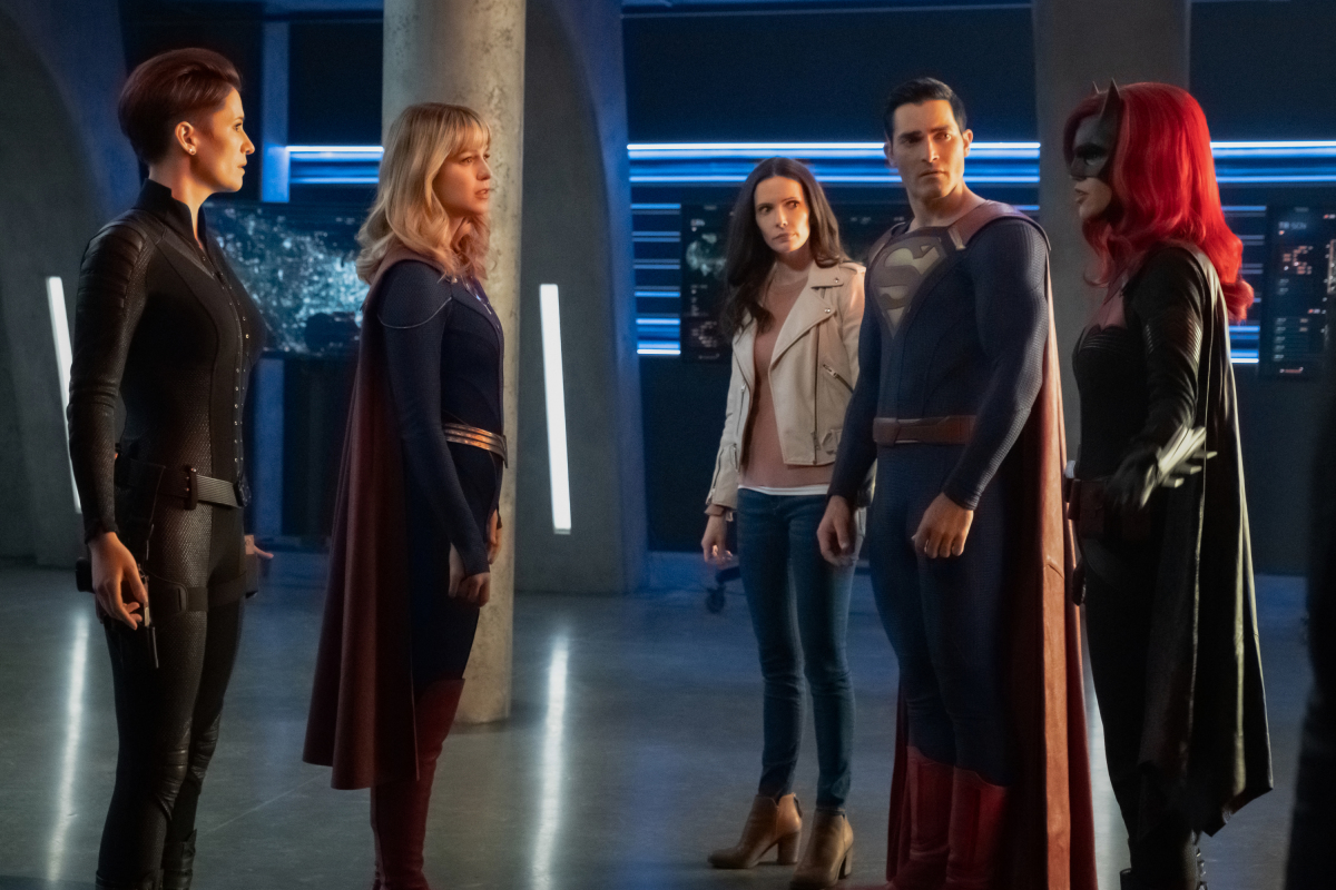 Supergirl -- "Crisis on Infinite Earths: Part One" -- Image Number: SPG509b_0093r.jpg -- Pictured (L-R): Chyler Leigh as Alex Danvers, Melissa Benoist as Kara/Supergirl, Elizabeth Tulloch as Lois Lane, Tyler Hoechlin as Clark Kent/Superman and Ruby Rose as Kate Kane/Batwoman -- Photo: Katie Yu/The CW -- © 2019 The CW Network, LLC. All Rights Reserved.
