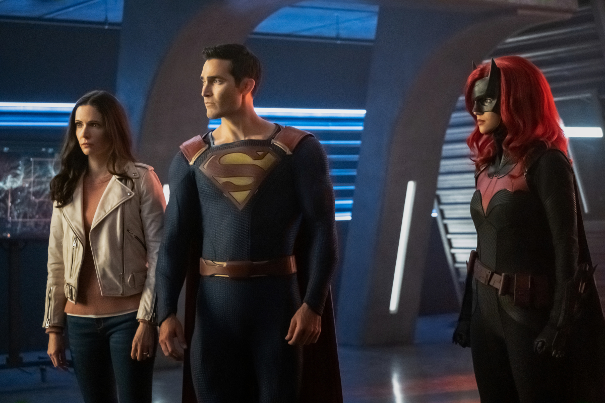 Supergirl -- "Crisis on Infinite Earths: Part One" -- Image Number: SPG509b_0158r.jpg -- Pictured (L-R): Elizabeth Tulloch as Lois Lane, Tyler Hoechlin as Clark Kent/Superman and Ruby Rose as Kate Kane/Batwoman -- Photo: Katie Yu/The CW -- © 2019 The CW Network, LLC. All Rights Reserved.