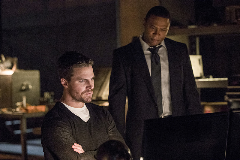 Arrow -- "What We Leave Behind" -- Image AR509a_0443b.jpg -- Pictured (L-R): Stephen Amell as Oliver Queen and David Ramsey as John Diggle -- Photo: Jack Rowand/The CW -- © 2016 The CW Network, LLC. All Rights Reserved.