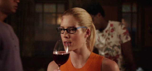 Most of the gang is reunited and talking about how to deal with Diaz. We’re assuming or hoping that’s a Nocking Point wine that Felicity is tasting.
