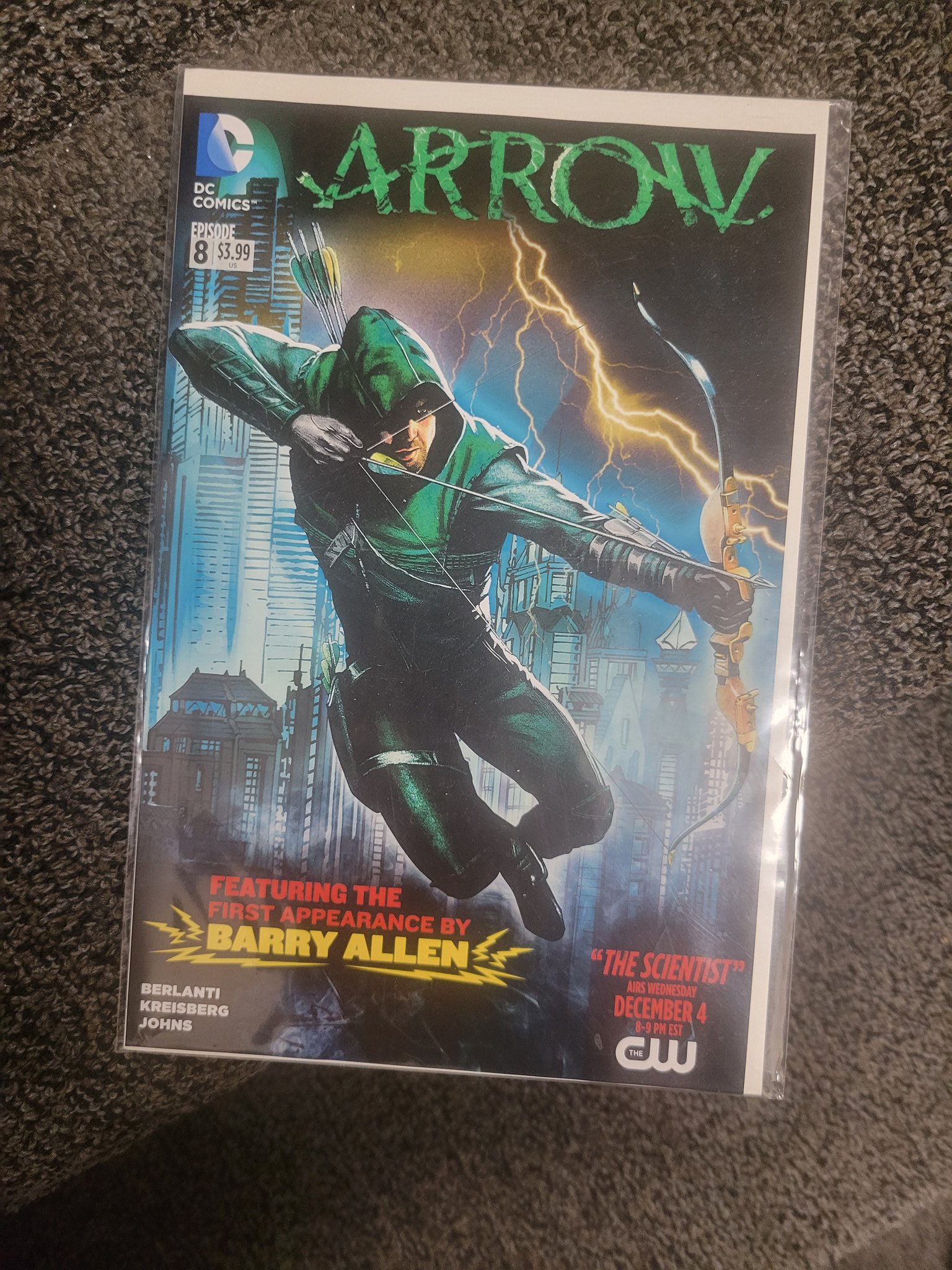 To promote the episode, The CW had sent special “comic book cover art” to members of the press to promote the episode. There probably aren’t very many still in existence, which would make this very rare. The “cover” (note, there’s no comic inside) features Green Arrow drawn in the likeness of Stephen Amell’s version of the character. The “cover” is in the style that was used by DC Comics at the time, complete with that awful “peel” DC logo they used at the time.